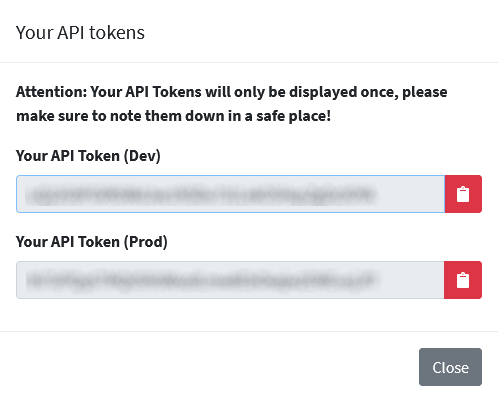 in the Actions column. Confirm the procedure and make sure to save your api keys! We recommend to frequently regenerate your API keys.